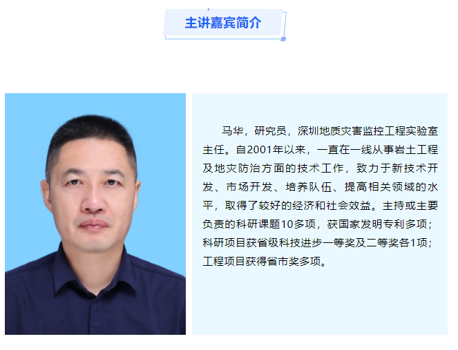 马华研究员系统讲解了深圳市边坡病害规律和现有加固技术存在的问题,分享了支挡结构加固改进技术,共同探讨了地质灾害防治工程的创新思路与成果市场化等内容。